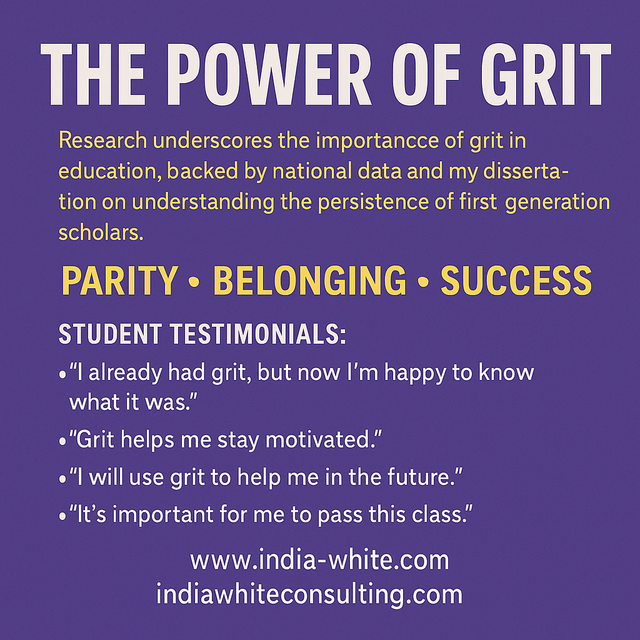 Cultivating Grit and Parity in the Classroom: Effective Strategies for Teachers In today’s educational landscape, fostering an environment where all students can thrive is more important than ever. Two concepts central to achieving this goal are grit and parity. Grit, characterized by perseverance and passion for long-term goals, and parity, which emphasizes equitable outcomes for all, work synergistically to create a foundation for student success. This blog explores practical strategies for implementing these ideas in the classroom, incorporating Dr. India White’s Grit Framework and essential pillars such as growth mindset, resilience, self-efficacy, and time management. Understanding Grit and Parity Grit is defined as the ability to maintain effort and interest over the long term despite challenges, as highlighted by Dr. Angela Duckworth. On the other hand, parity in education means ensuring that all students, regardless of their backgrounds or abilities, have equal opportunities to succeed academically. Creating a learning environment that emphasizes both concepts can support students in their academic and personal development. Teacher Tips for Effective Implementation of Grit and Parity 1. Set Clear, High Expectations: - Cultivate a classroom where high expectations are the norm. Communicating that effort is as important as achievement encourages students to embrace challenges and develop grit. - Strategy : Clearly outline objectives and performance standards, and highlight examples of resilience in achieving long-term goals. 2. Differentiate Instruction for Equitable Outcomes: - Offering tailored support to meet diverse student needs promotes parity. Use assessments to identify areas where students struggle, enabling you to provide targeted interventions and supports. - Strategy : Regularly assess student understanding and adjust instruction accordingly. Make use of various teaching modalities, such as small group instruction or one-on-one support. 3. Foster a Growth Mindset: - Instill the belief that abilities can be developed through dedication and hard work. A growth mindset, as defined by Dr. Carol Dweck, contributes to resilience and encourages students to see challenges as opportunities for improvement. - Strategy : Use positive language that reinforces effort and learning from setbacks. Encourage students to reflect on their learning journeys and recognize their growth over time. 4. Incorporate the Grit Framework: - Dr. India White’s Grit Framework outlines key pillars that support the development of grit: resilience, self-efficacy, and effective time management. By integrating these principles into your teaching, you can cultivate a classroom culture that encourages persistence. - Strategy : Embed discussions on resilience into lesson plans, and provide students with tools and strategies for improving self-efficacy and managing their time effectively. 5. Create Opportunities for Collaboration: - Collaborative learning environments enhance both parity and grit. When students work together, they learn from one another and build a supportive community that fosters resilience. - Strategy: Design team-based projects that encourage problem-solving and critical thinking. Assign roles that promote individual accountability while fostering group collaboration. 6. Celebrate Progress and Effort: - Shift the focus from solely recognizing final achievements to celebrating effort and incremental progress, reinforcing the value of grit. - Strategy : Establish a recognition system where students can share their efforts and successes, such as a “growth board” showcasing milestones related to resilience and persistence in learning. 7. Develop Time Management Skills: - Teaching students effective time management strategies helps them prioritize tasks and allocate time for practice and study, which is essential for developing grit and achieving parity. - Strategy : Provide tools such as planners or digital apps to help students organize their assignments and set realistic timelines. Teach them to set short- and long-term goals, breaking larger tasks into manageable steps. 8. Utilize Student Feedback: - Gathering student feedback about their learning experiences encourages them to express their needs and challenges. This insight guides the development of teaching strategies that promote both grit and p arity. - Strategy: Use surveys or class discussions to gather insights and adjust your teaching to better meet students' needs. Resources for Further Reading - Duckworth, A. (2016). Grit: The Power of Passion and Perseverance. Scribner. - This book delves into the significance of grit and provides strategies for fostering resilience and persistence. - White, I. (2020). Understanding the Persistence of First-Generation College Students (Doctoral dissertation). University of Florida. - This dissertation examines factors contributing to the persistence of first-generation students and offers practical recommendations for educators. - Dweck, C. S. (2006). Mindset: The New Psychology of Success. Random House. - This book discusses the implications of adopting a growth mindset in education and how it affects resilience and learning outcomes. Conclusion Integrating grit and parity into the classroom not only supports immediate academic success but also equips students with essential skills for lifelong learning. By implementing strategies that cultivate resilience, build self-efficacy, promote effective time management, and foster a growth mindset, educators can create an inclusive and supportive learning environment. In doing so, they empower every student to face challenges with tenacity and achieve their goals, transforming their educational journey into a path of success and fulfillment.