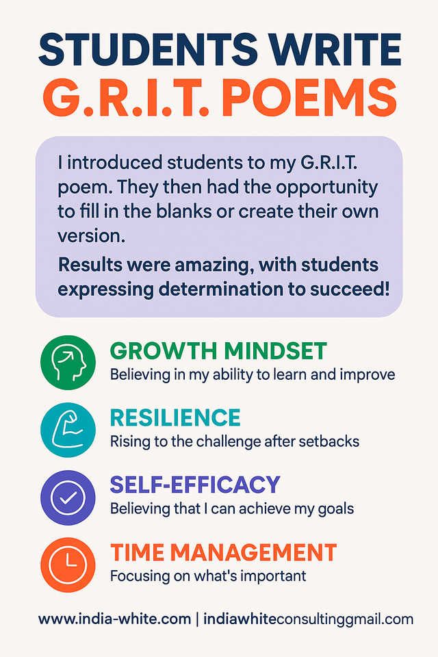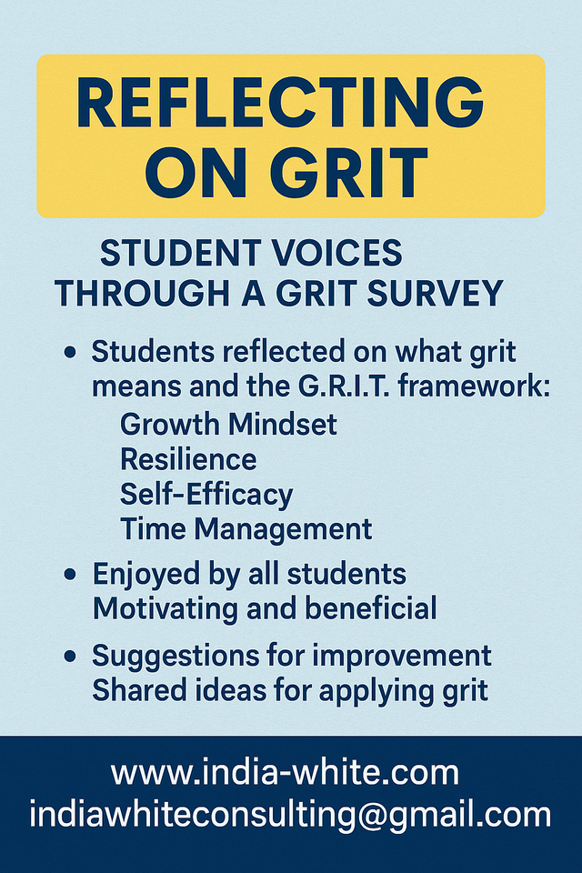 Building Grit in Students through Reflection Activities During a recent training session, I guided students through a structured activity designed to help them reflect on grit and personal accountability. This exercise encouraged them to explore how the G.R.I.T. framework—Growth Mindset, Resilience, Self-Efficacy, and Time Management—applies to their learning and development.^1 Students first participated in guided discussions on grit, focusing on strategies to remain committed, build resilience, and complete assignments on time.^2 Each student then journaled about their personal grit levels, identifying areas of strength and growth. This journaling provided a safe space for honest self-assessment and highlighted the importance of intentional focus.^3 The activity also included collaborative reflection where students discussed their “grit weeks,” emphasizing how to manage distractions, stay accountable, and complete tasks with perseverance.^4 By engaging in both personal reflection and peer discussion, students were able to see grit not as an abstract idea but as a practical tool to help them reach goals.^5 Through journaling and reflection, students deepened their understanding of the four pillars of the G.R.I.T. framework. Many expressed excitement for what lies ahead in their academic journey, recognizing that perseverance and accountability are vital to their long-term success.^6 The activity reinforced the importance of grit in education by providing students with practical tools for self-awareness and improvement. As Angela Duckworth emphasizes, grit involves sustained passion and perseverance over the long term.^7 Likewise, the Power of G.R.I.T. Workbook stresses that equipping students with reflective practices helps foster resilience and determination as they grow academically and personally.^8 Footnotes 1. Angela Duckworth, Grit: The Power of Passion and Perseverance (New York: Scribner, 2016), 8–9. 2. India White, The Power of G.R.I.T. Workbook (Tampa, FL: White Education Consulting, 2023), 12. 3. Duckworth, Grit, 44. 4. White, Power of G.R.I.T. Workbook, 28. 5. Duckworth, Grit, 92. 6. White, Power of G.R.I.T. Workbook, 46. 7. Duckworth, Grit, 275. 8. White, Power of G.R.I.T. Workbook, 59. Bibliography Duckworth, Angela. Grit: The Power of Passion and Perseverance. New York: Scribner, 2016. White, India. The Power of G.R.I.T. Workbook. Tampa, FL: Rising Glory Productions LLC, 2023.
