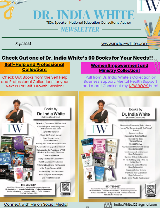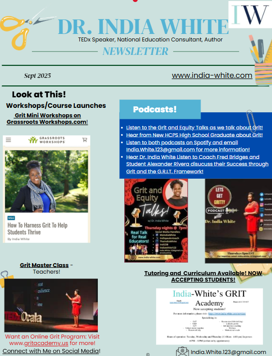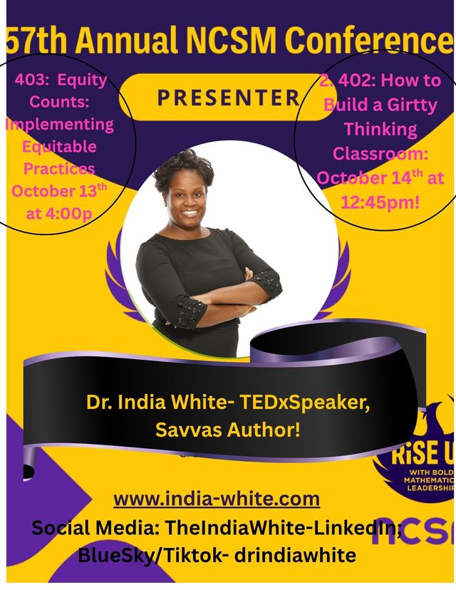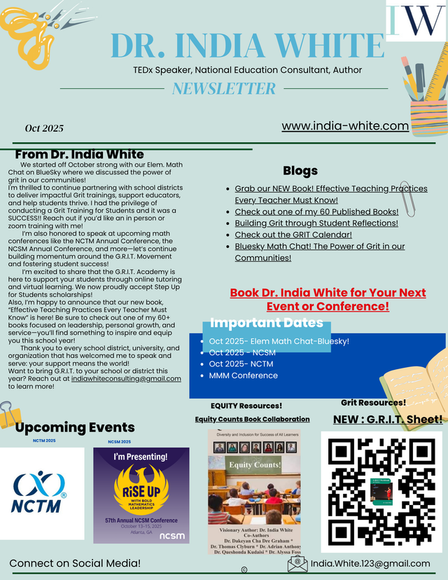 ✨ Exciting October Update! ✨ I’m thrilled to share that my October Newsletter is live! This month, I’m honored to be speaking at both NCTM and NCSM—two powerful opportunities to connect with educators nationwide about building G.R.I.T. (Growth Mindset, Resilience, Self-Efficacy, and Time Management) and closing the achievement gap. 💡 I’m so grateful for the incredible teachers and leaders who continue to inspire and partner with me. Thank you for the work you do every day to make an impact in the lives of students! Check out the newsletter and explore resources here: 👉 www.india-white.com Let’s keep building grit and creating equity in education—together. 💪📚✏️