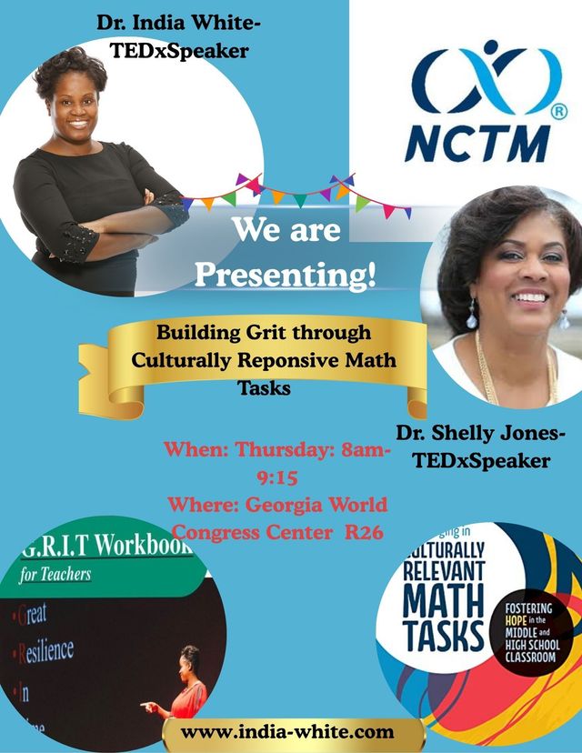 I am thrilled to announce that I will be a featured speaker at the NCTM 2025 Conference alongside the incredible Dr. Shelly Jones, Room 406. As TEDx speakers, Dr. Jones and I are uniting our passions for mathematics, equity, and purpose-driven teaching in our session titled Building Grit Through Culturally Relevant Math Tasks. Dr. Shelly Jones will share powerful insights from her book Culturally Relevant Math Tasks to Engage All Learners, which emphasizes how educators can connect mathematical concepts to students’ cultural experiences and lived realities. Her work highlights the importance of inclusion, representation, and authentic learning experiences that empower every student to see themselves as capable mathematicians. In my portion of the session, I will focus on Building Grit through the G.R.I.T. Framework—which stands for Growth Mindset, Resilience, Self-Efficacy, and Time Management. Through this framework, I will share strategies from my *G.R.I.T. Workbook for Educators* to help teachers cultivate perseverance and confidence in students as they navigate challenging math tasks. The goal is to help students not only solve problems but also believe they can thrive through productive struggle and perseverance. Together, Dr. Jones and I aim to inspire educators to blend cultural reasoning with resilience-building practices—creating classrooms where students’ identities and determination are celebrated equally. I’m excited to connect with passionate educators at NCTM 2025 and share how we can all build grit, equity, and excellence in math education.