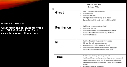 Building Grit in Our Elementary Math Communities This week I had the privilege of hosting an **Elementary Math Chat on BlueSky**, where educators from across the nation gathered to talk about one of my favorite topics: the **power of grit** in our classrooms and communities. The energy, collaboration, and passion from teachers, leaders, and math coaches reminded me once again of why this work matters. Why Grit in Math? We started by examining the latest NAEP data, which paints a sobering picture of how our students are performing in mathematics. While test scores often highlight areas of struggle, they also invite us as educators to ask a deeper question: How can we better equip our students to persist through challenges? This is where the G.R.I.T. framework—Growth Mindset, Resilience, Self-Efficacy, and Time Management—becomes a game-changer. Exploring the G.R.I.T. Framework During the chat, educators reflected on how grit shows up in their classrooms: Growth Mindset helps students believe they can learn math, even when it feels difficult. Resilience gives students the courage to keep trying when a solution isn’t clear right away. Self-Efficacy instills confidence that “I can solve problems if I keep working at them.” Time Management reminds students that persistence requires discipline and prioritization. Together, these pillars equip students to face not only academic challenges but also life’s challenges with courage and determination. G.R.I.T. Games and Assessments We also discussed two practical tools for teachers to bring grit alive in the math classroom: G.R.I.T. Games : Engaging activities that give students the chance to practice perseverance in fun, low-stakes ways while still reviewing math concepts. G.R.I.T. Assessment: A reflective tool for students to evaluate their own growth in grit—identifying where they are strong and where they can build more perseverance. These resources empower both teachers and students to see grit not as an abstract concept, but as something real, measurable, and impactful. Grit Beyond the Classroom One of my favorite takeaways from the chat was hearing educators share how grit impacts not just math performance but also the wider school community. When students develop grit, they become more confident problem-solvers, more engaged learners, and more supportive peers. This mindset spreads beyond the classroom walls, creating resilient communities that thrive together. Moving Forward The Elementary Math Chat reminded us that teaching math isn’t just about numbers—it’s about nurturing resilient thinkers who can face challenges with determination. As we continue to share strategies, reflect on data, and support one another, I’m excited to see how grit will transform classrooms across the nation. Let’s keep the conversation going: together, we can ensure every student has the tools to persist, grow, and succeed. Dr. India White is a national speaker, math consultant, and author of the G.R.I.T. framework. For professional development, G.R.I.T. trainings, or speaking engagements, connect at www.india-white.com