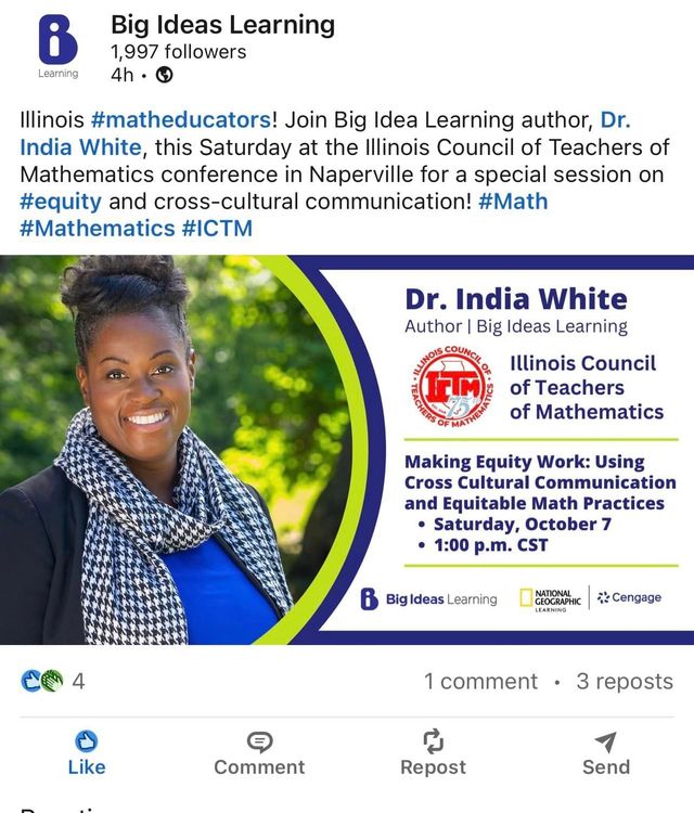 Hey Illinois educators!🤩 I’m looking forward to joining each of you this Saturday we we talk about Makng Equity Work through equitable math practices in the classroom! 🤩😁🎊Join me at 1p this Saturday and bring a friend! You don’t want to miss this session. And… I will be having a BOOK SIGNING of our NEW Math and YOU Textbooks for you guys, first come first serve! 😃We will also give away some of my Equity Counts! books, so stay tuned so you can get what you want while we are with you this weekend! 🥰