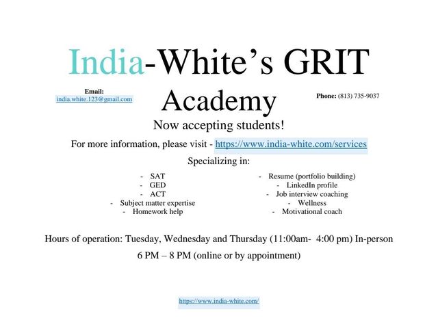 With a Bachelor of Science in math from the University of Florida and a math teacher for over 10 years and 2x nominated Teacher of the Year, India White has rejoiced in seeing thousands of her students walk across the graduation stage college and career ready. India has enjoyed teaching middle and high school math in all topics covered on the FSA, EOC exams and Common Core standards. She has proven that rigor can take place in any rural or inner-city environment and has a gift to take learning to the next level. One on one sessions of tutoring have produced gains on standardized exams that boosted achievement by 2 or more levels! Join the G.R.IT. Academy LLC So we can serve you today!