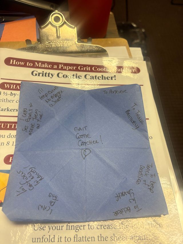 As students played, they weren’t just folding paper or choosing numbers—they were reflecting on how grit shows up in their daily lives. Many shared stories about pushing through challenges, staying consistent, or learning from mistakes. Watching them connect the dots while having fun was a reminder that sometimes the simplest tools can spark the deepest learning.