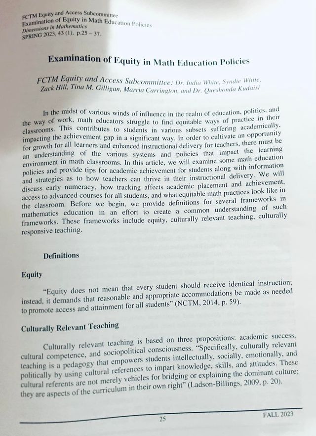 Shout out to the Florida Council of Teachers of Mathematics’ Equity and Access Committee for publishing an article on Equitable Math Policies and Practices in Florida! 😀