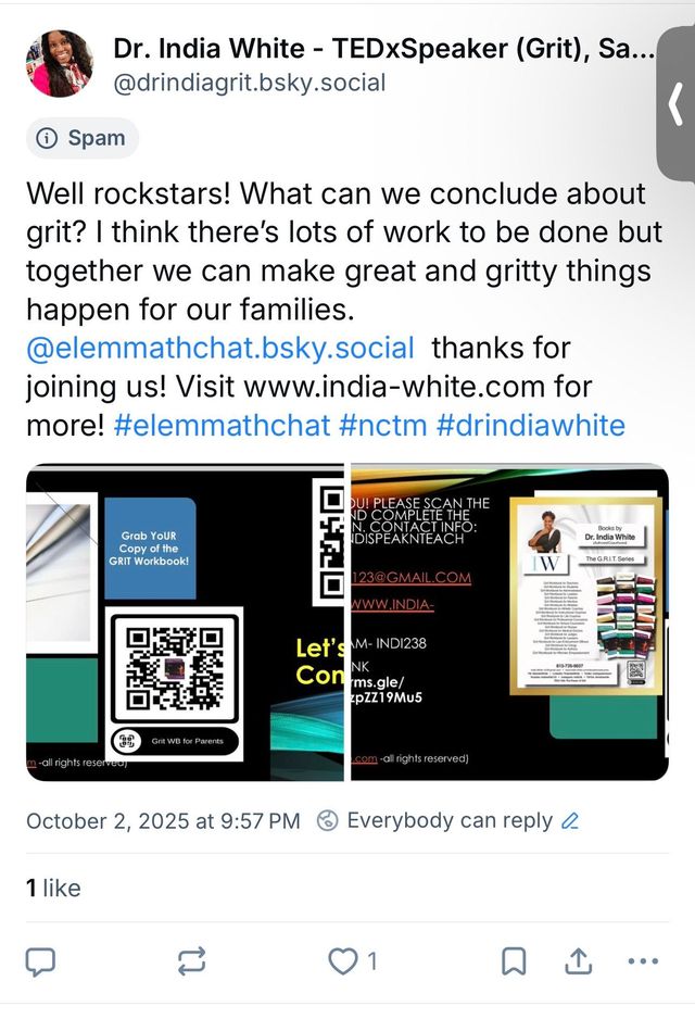 We had a BLAST during our Elem Math Chat on BlueSky! Dr. India White- TEDxSpeaker, Grit Trainer, Savvas Author!